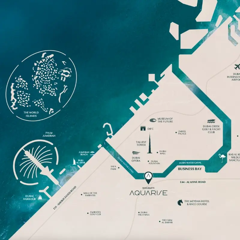 Binghatti Aquarise is located at the heart of Business Bay with impeccable location advantages for business as well as family. Just minutes away from Downtown Dubai, escapades to its icons such as the Burj Khalifa or The Dubai Mall or Dubai Opera become instantly reachable.