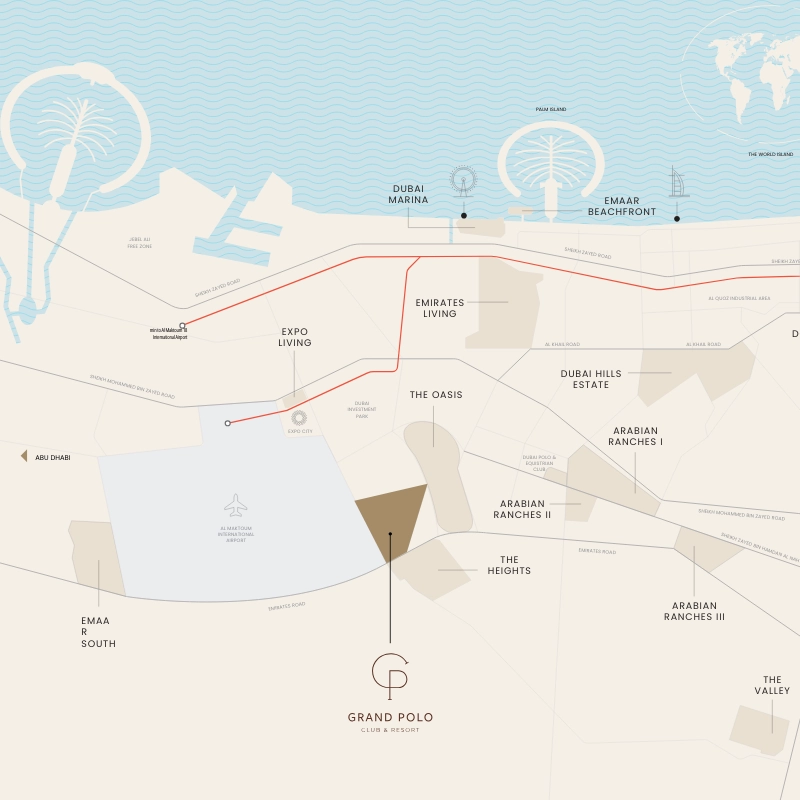 Grand Polo Club & Resort offers the perfect blend of tranquility and connectivity. Situated just 5 minutes from Al Maktoum International Airport, 20 minutes from Dubai Hills Estate and Dubai Hills Mall, 28 minutes from Dubai Marina and Dubai Marina Mall, and only 35 minutes from Downtown Dubai and Dubai Mall, the location ensures effortless access to the city’s most vibrant destinations, while providing a calm secluded retreat to call home.